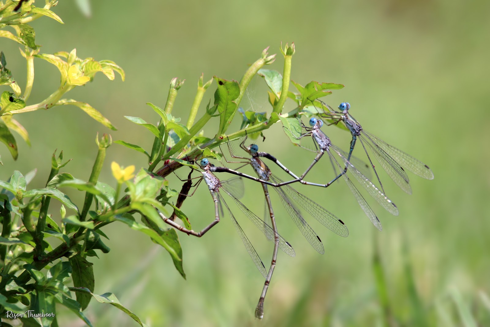 സൂചിത്തുമ്പികൾക്ക് മറ്റു പ്രാണികളെ അപേക്ഷിച്ചു വളരെ സങ്കീർണ്ണമായ ബീജക്കൈമാറ്റ രീതിയാണുള്ളത്. ഇണചേരലിന്റെ ആദ്യപടിയായി ആൺത്തുമ്പി തന്റെ ശരീരത്തിന്റെ ഏറ്റവും പുറകിലായുള്ള കുറുവാൽ(Anal appedages) എന്ന അവയവമുപയോഗിച്ച് പെൺത്തുമ്പിയുടെ തലയ്ക്കും ഉരസ്സിനും(Head and Thorax) ഇടയിലായി പിടിക്കുന്നു (Tandem position). പിന്നീട് കുറുവാലിനോട് ചേർന്നുള്ള ജനനേന്ദ്രിയത്തിത്തിൽ നിന്നും(Primary genetalia) ബീജം തുമ്പിയുടെ രണ്ടാം ഖണ്ഡത്തിലുള്ള ദ്വിദീയ ജനനേന്ദ്രിയത്തിലേക്കു(Secondary genetalia) മാറ്റുന്നു. പിന്നീട് പെൺതുമ്പി തന്റെ ഉദരം വളച്ചു ഉദരത്തിലെ എട്ട് ഒൻപത് ഖണ്ഡങ്ങളിലുള്ള മുട്ടയിടാനുള്ള അവയവം (Ovipositor)ആൺത്തുമ്പിയുടെ ദ്വിദീയ ജനനേന്ദ്രിയത്തോട് ചേർക്കുന്നു(Wheel position). അങ്ങനെ ബീജക്കൈമാറ്റം പൂർണ്ണമാകുന്നു. ചിത്രങ്ങൾ സഹിതം എനിക്ക് കഴിയാവുന്ന രീതിയിൽ വിശദമാക്കാൻ പരമാവധി ശ്രമിച്ചിട്ടുണ്ട്.